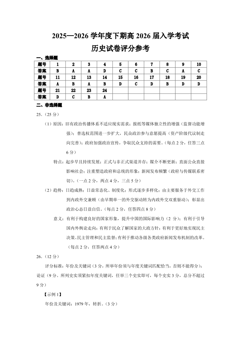 高三历史答案--四川省成都市第七中学2026届高三下期高开学考试