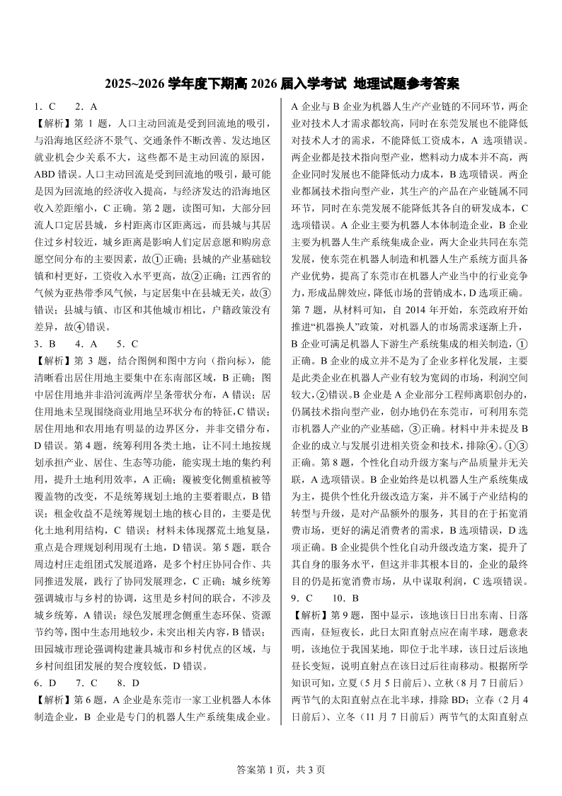 高三地理答案--四川省成都市第七中学2026届高三下期高开学考试