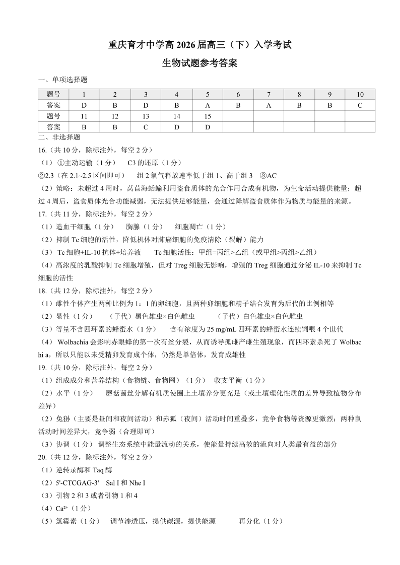 高三生物答案--重庆市育才中学2026届高三下学期入学考试