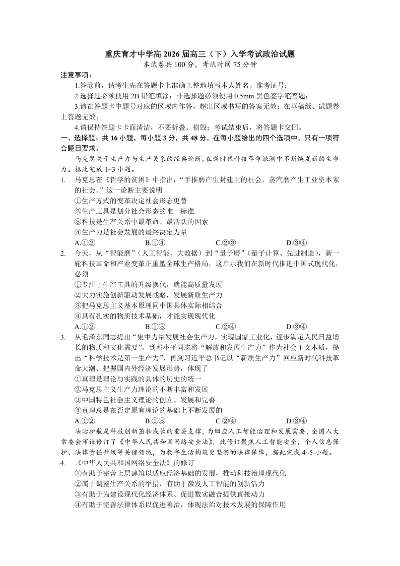高三政治--重庆市育才中学2026届高三下学期入学考试