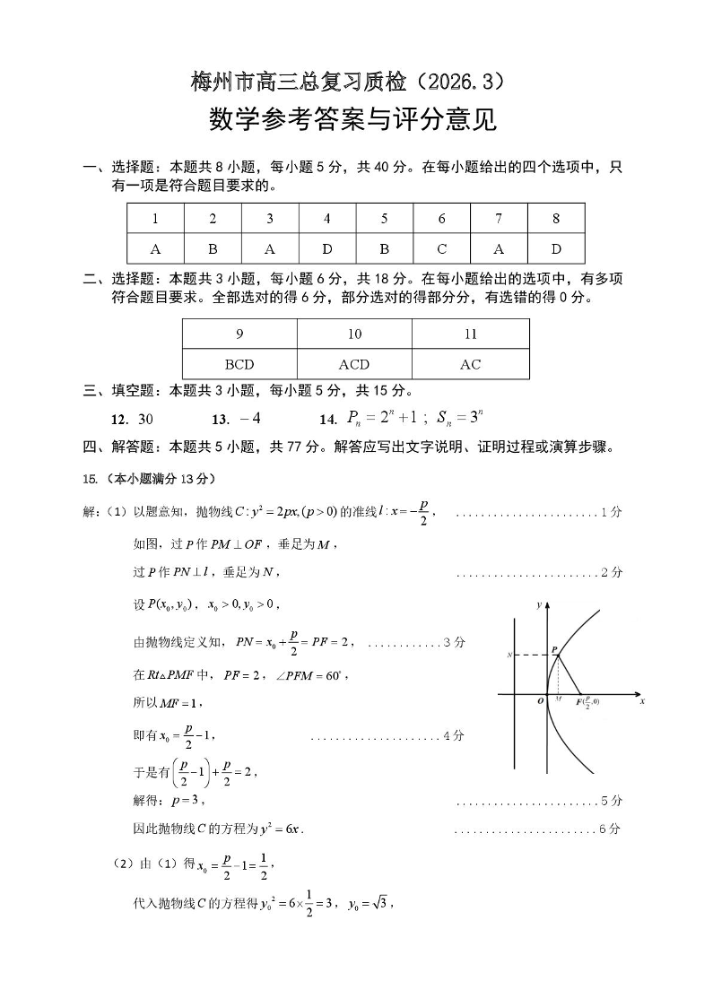 高三数学答案--广东梅州市2026届高三下学期3月总复习质检