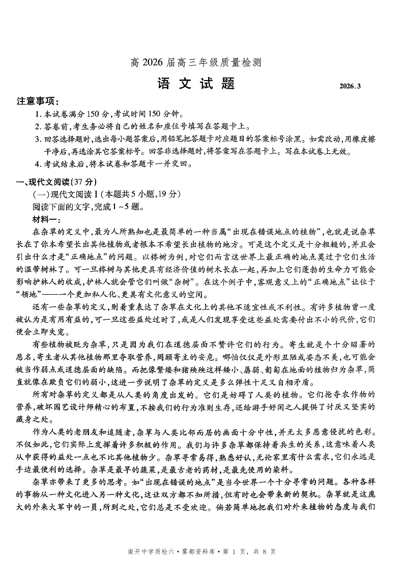 高三语文--重庆市南开中学2026届高三第六次质量检测
