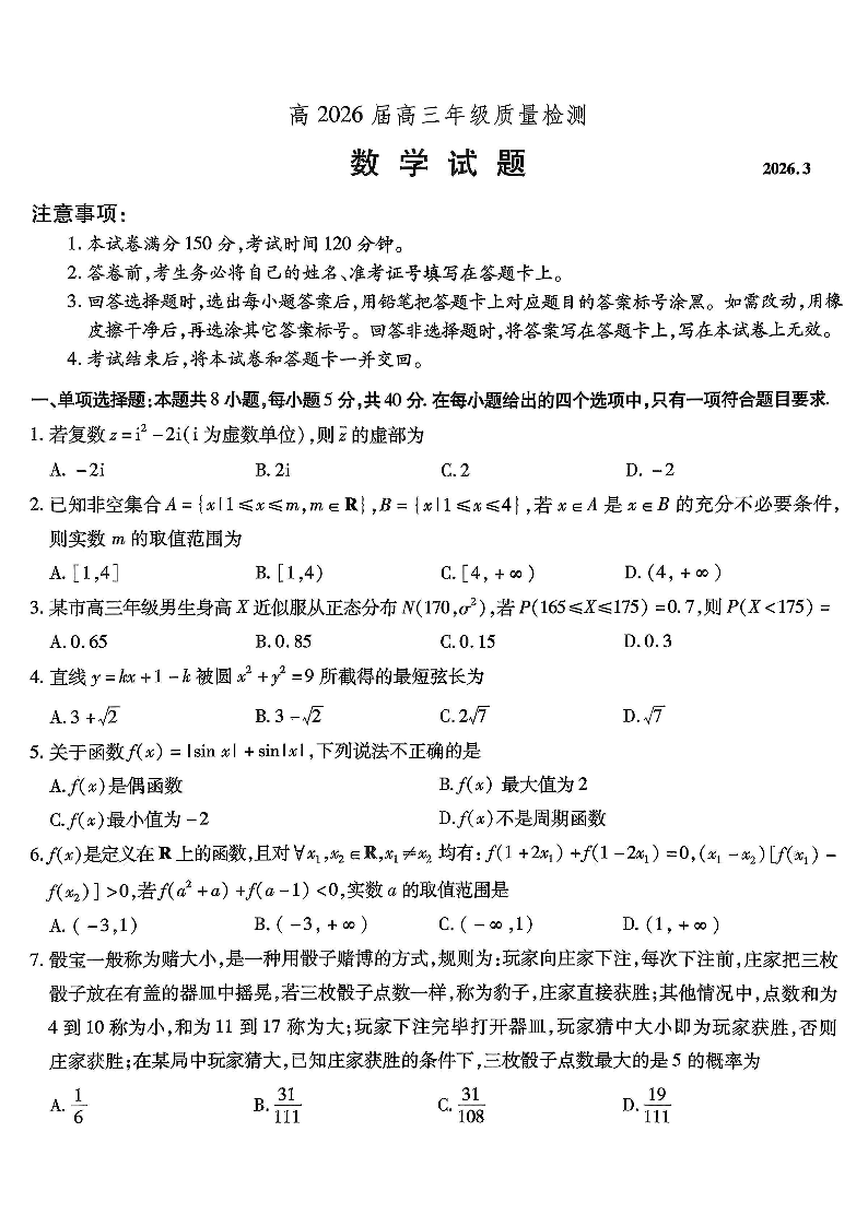 高三数学--重庆市南开中学2026届高三第六次质量检测