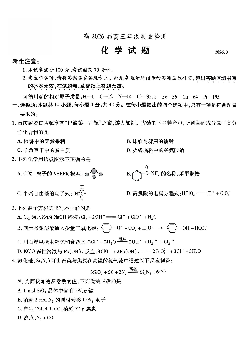 高三化学--重庆市南开中学2026届高三第六次质量检测
