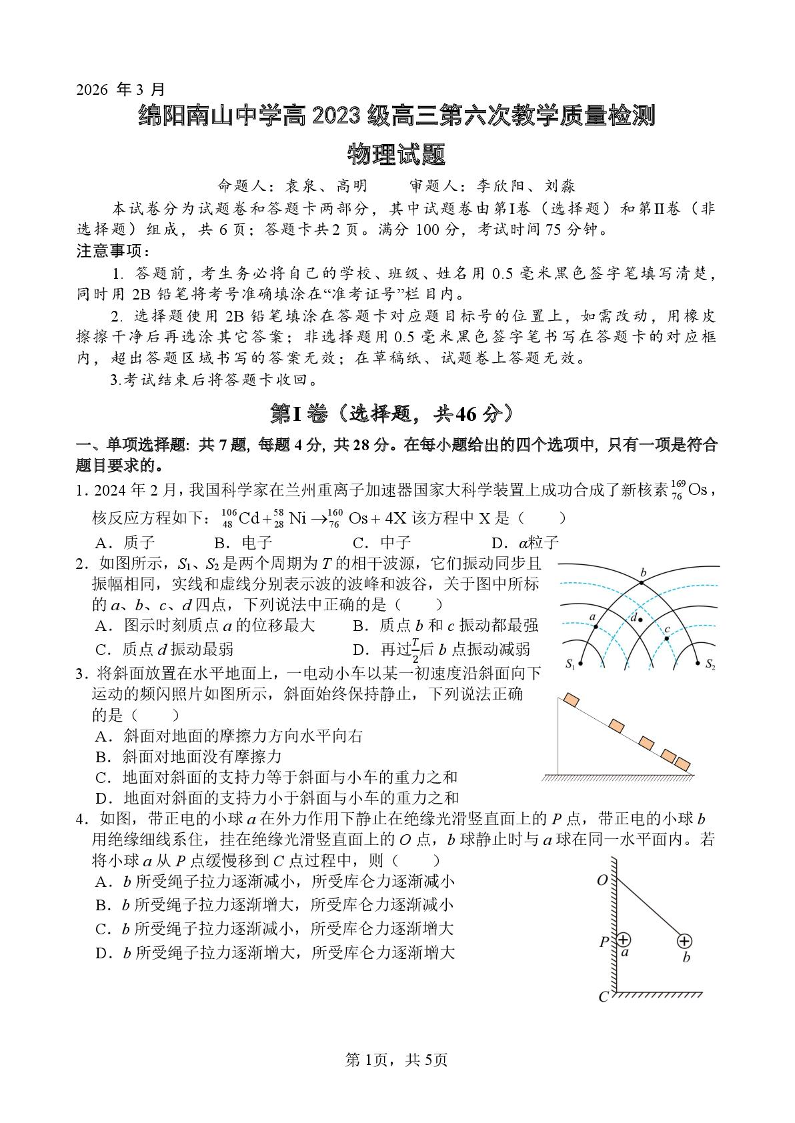 高三物理--四川省绵阳南山中学2026届高三第六次教学质量检测