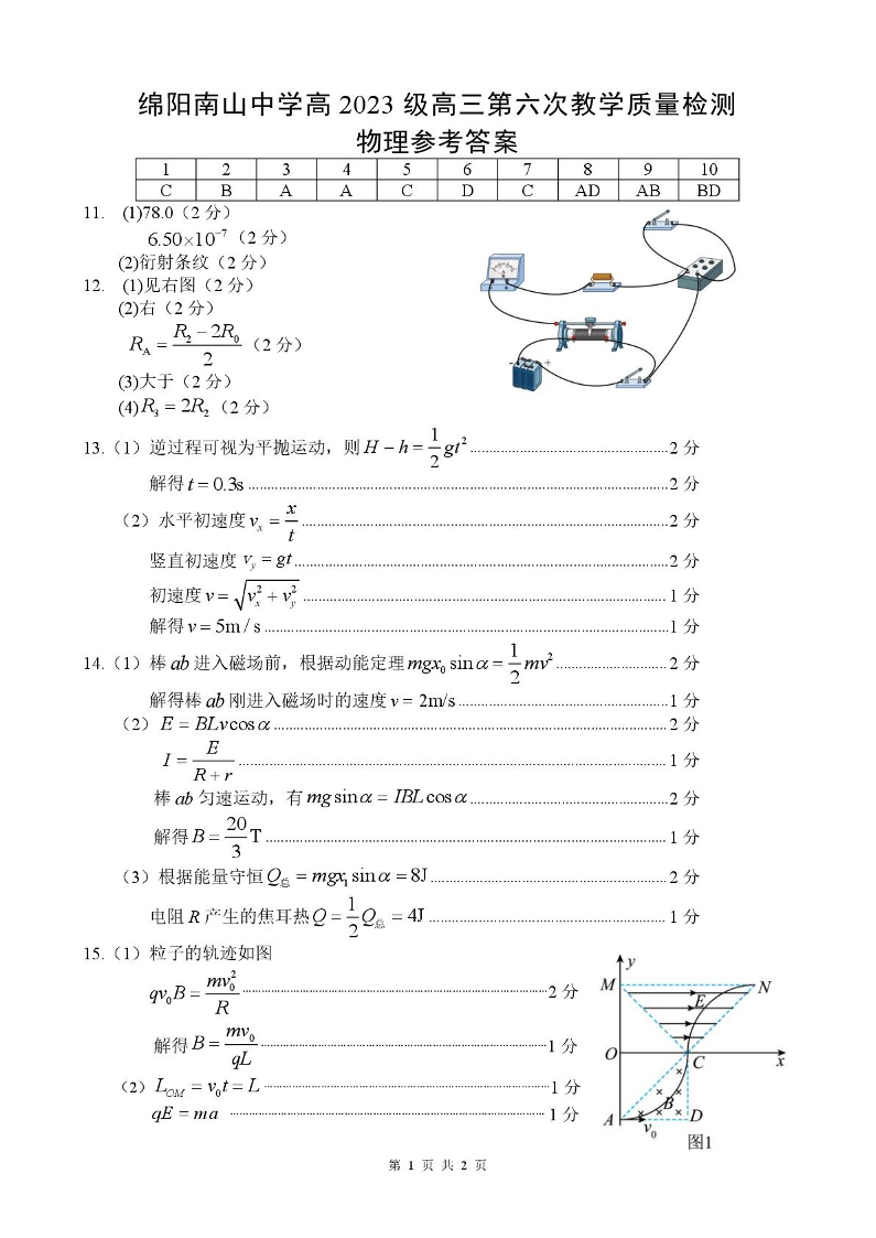 高三物理答案--四川省绵阳南山中学2026届高三第六次教学质量检测