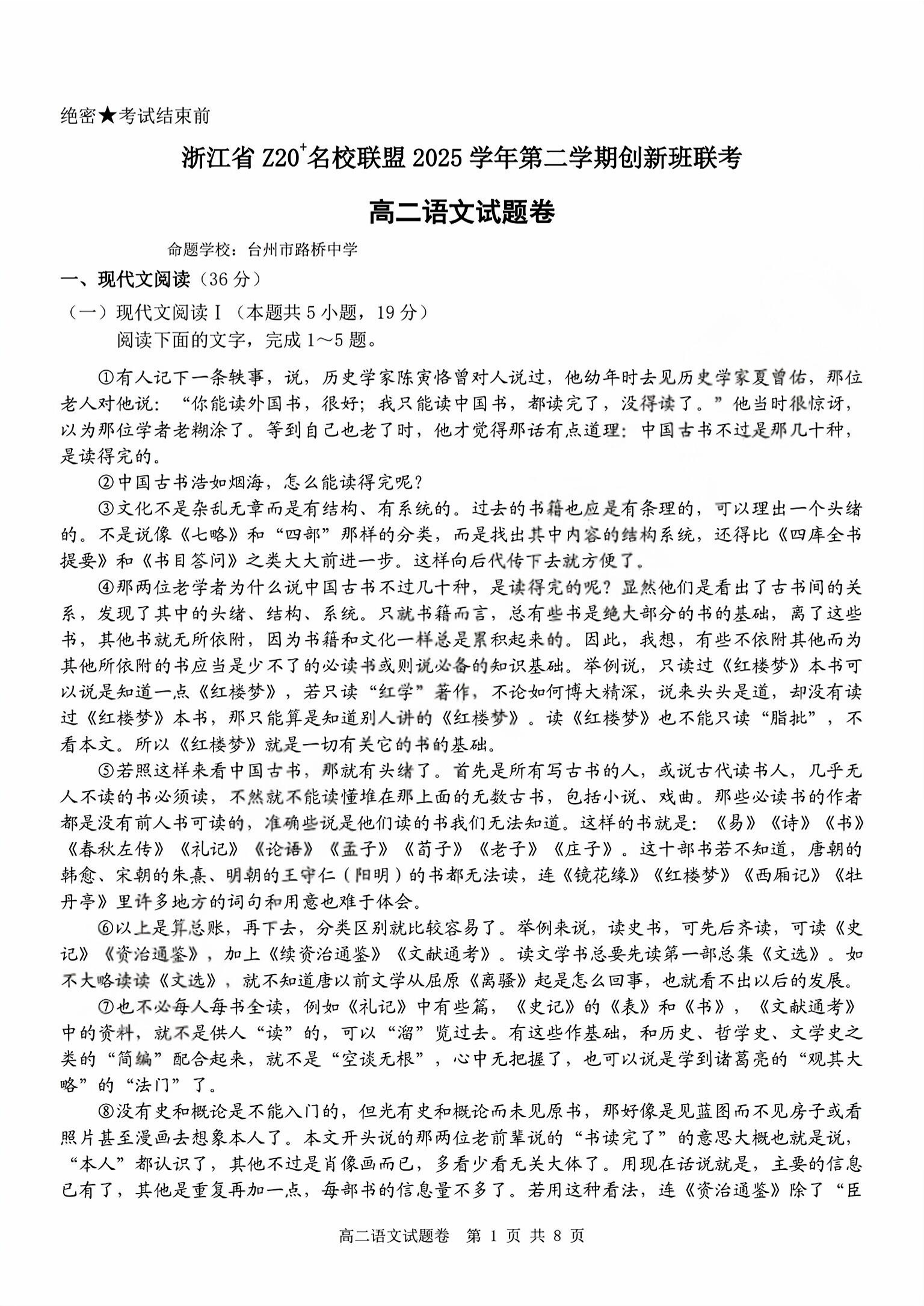 高二语文+答案--浙江省Z20名校联盟2025-2026学年高二创新班开学联考