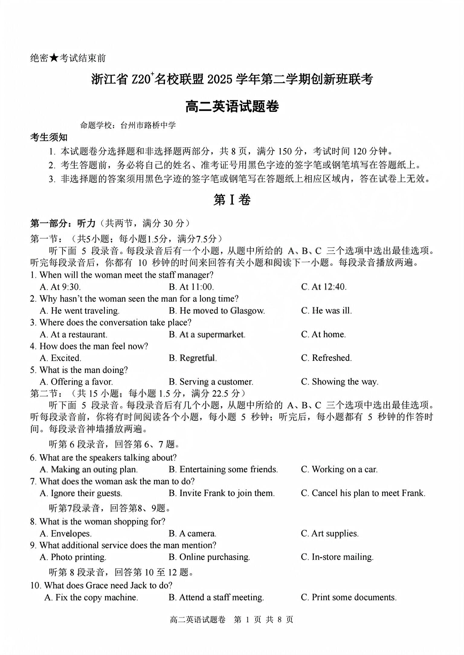 高二英语+答案--浙江省Z20名校联盟2025-2026学年高二创新班开学联考