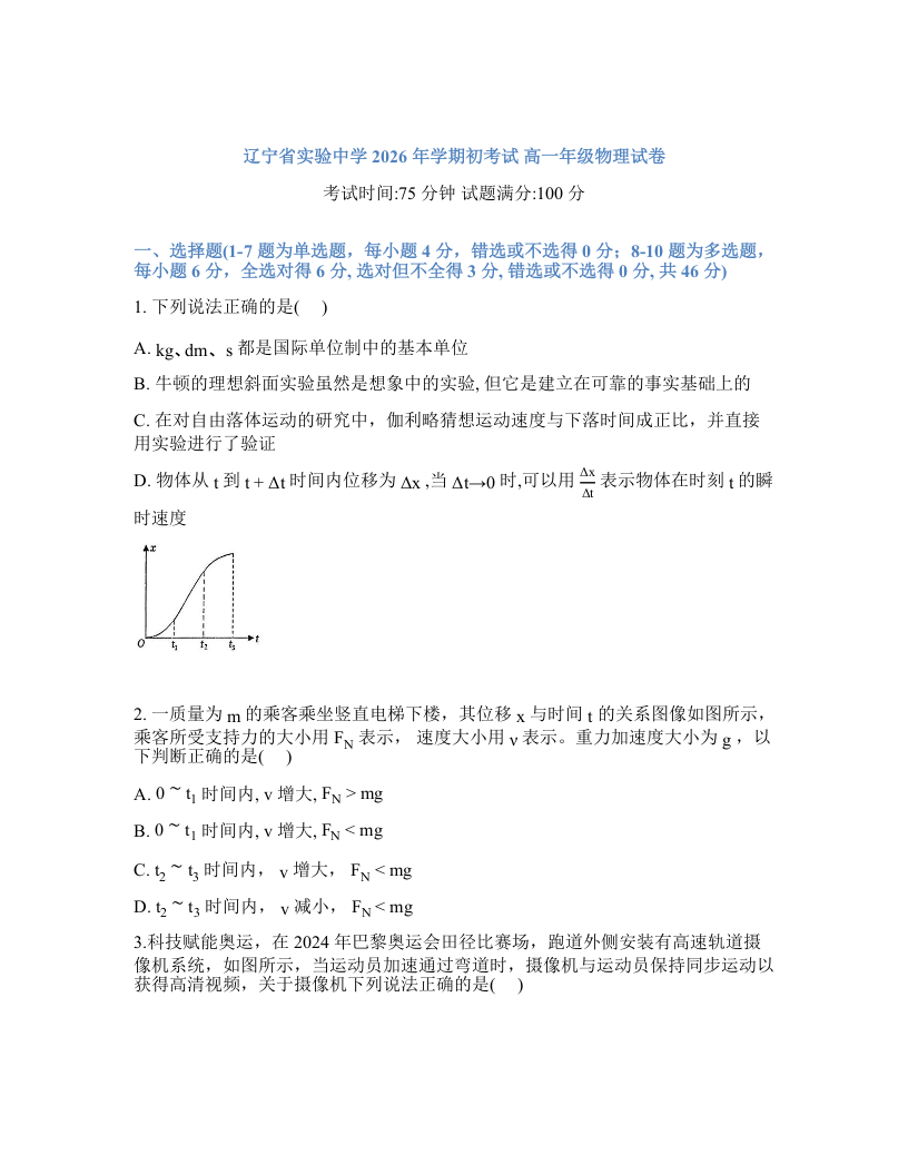 高一物理+答案--辽宁省实验中学2025-2026学年高一下学期2月期初考试