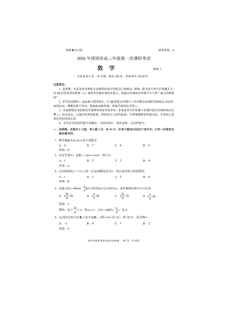高三数学+答案--广东省深圳市2026届高三第一次调研考试(深圳一模)