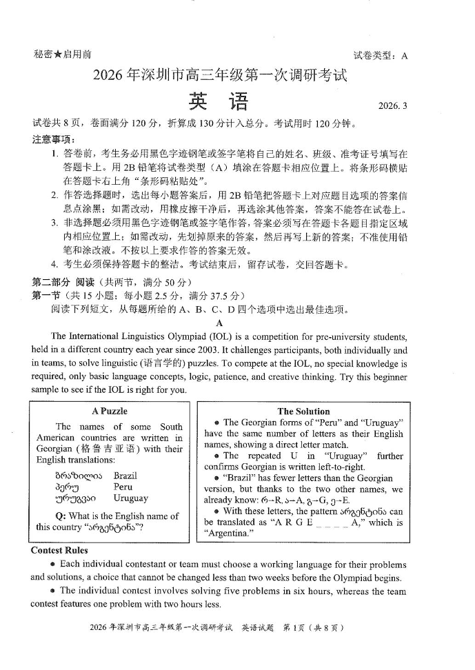 高三英语--广东省深圳市2026届高三第一次调研考试(深圳一模)