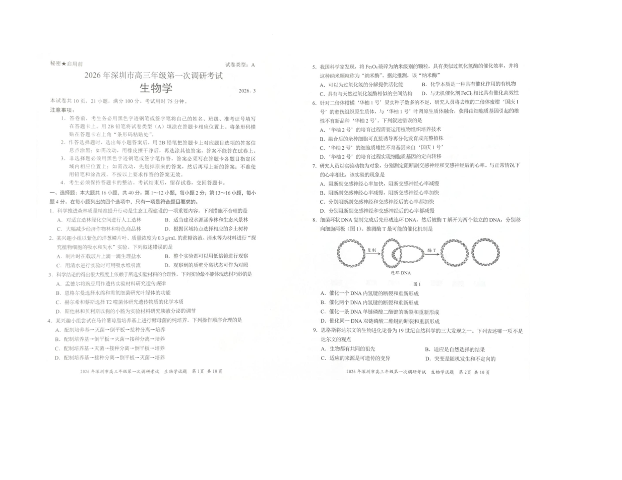 高三生物--广东省深圳市2026届高三第一次调研考试(深圳一模)