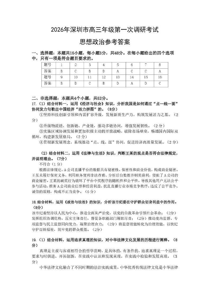 高三政治答案--广东省深圳市2026届高三第一次调研考试(深圳一模)