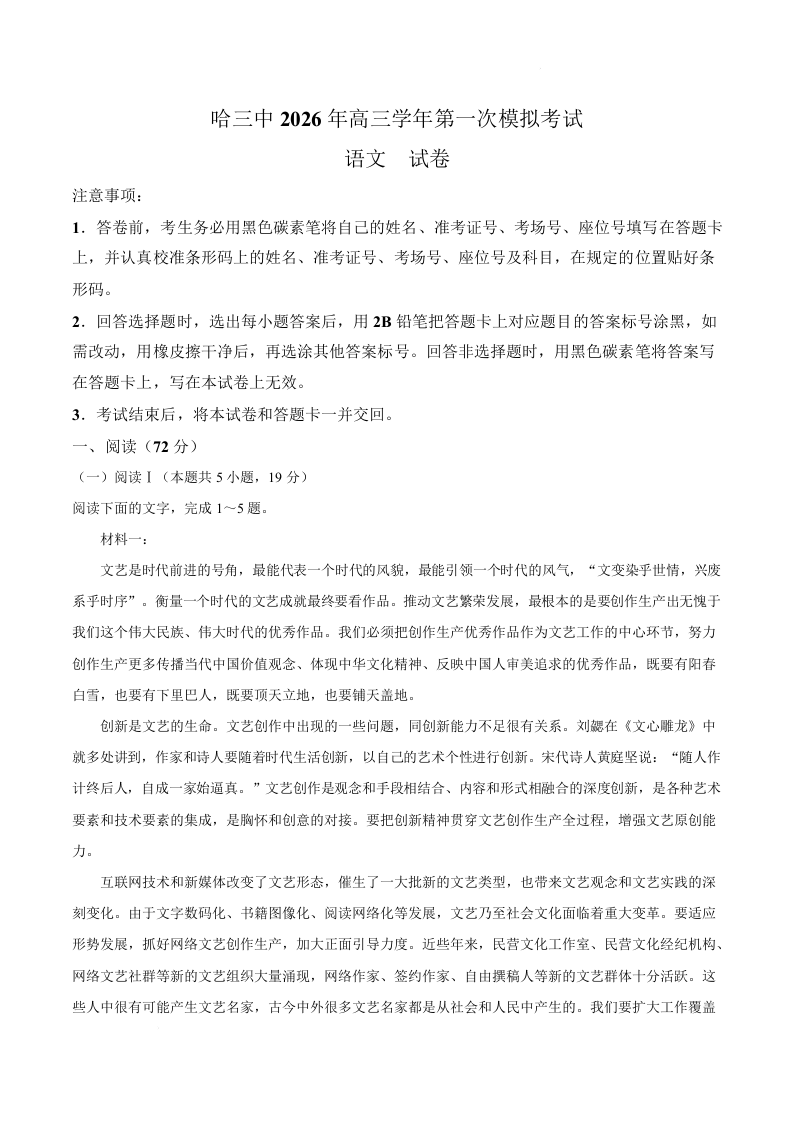 高三语文--黑龙江省哈尔滨市第三中学校2026届高三第一次模拟考试