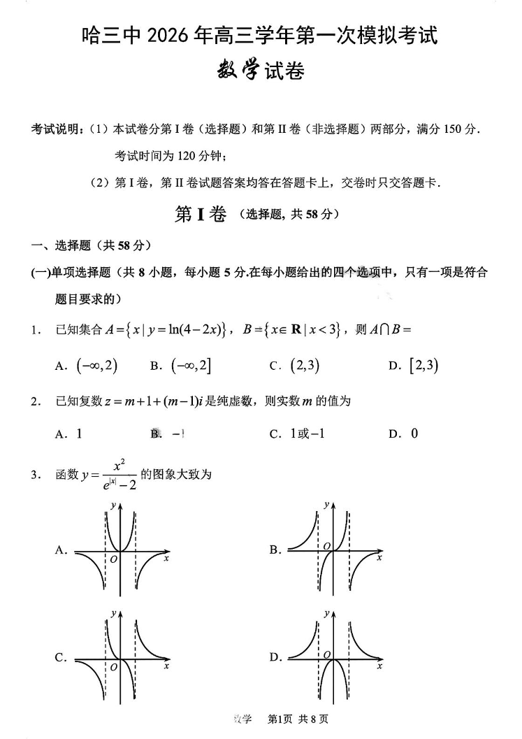 高三数学--黑龙江省哈尔滨市第三中学校2026届高三第一次模拟考试