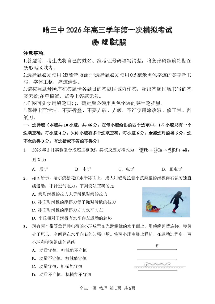 高三物理--黑龙江省哈尔滨市第三中学校2026届高三第一次模拟考试