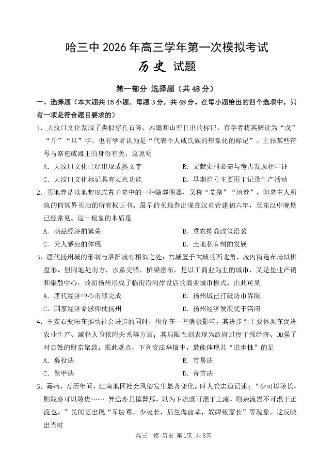 高三历史--黑龙江省哈尔滨市第三中学校2026届高三第一次模拟考试