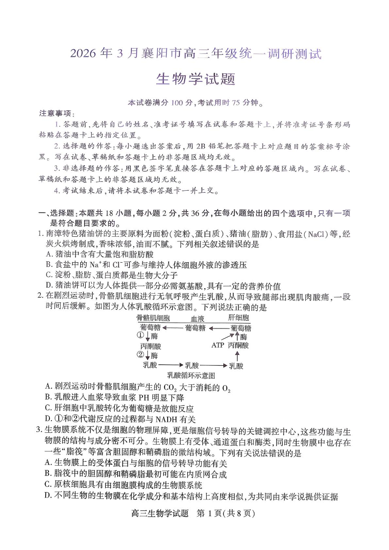 高三生物--湖北襄阳市2026届高三3月统一调研测试