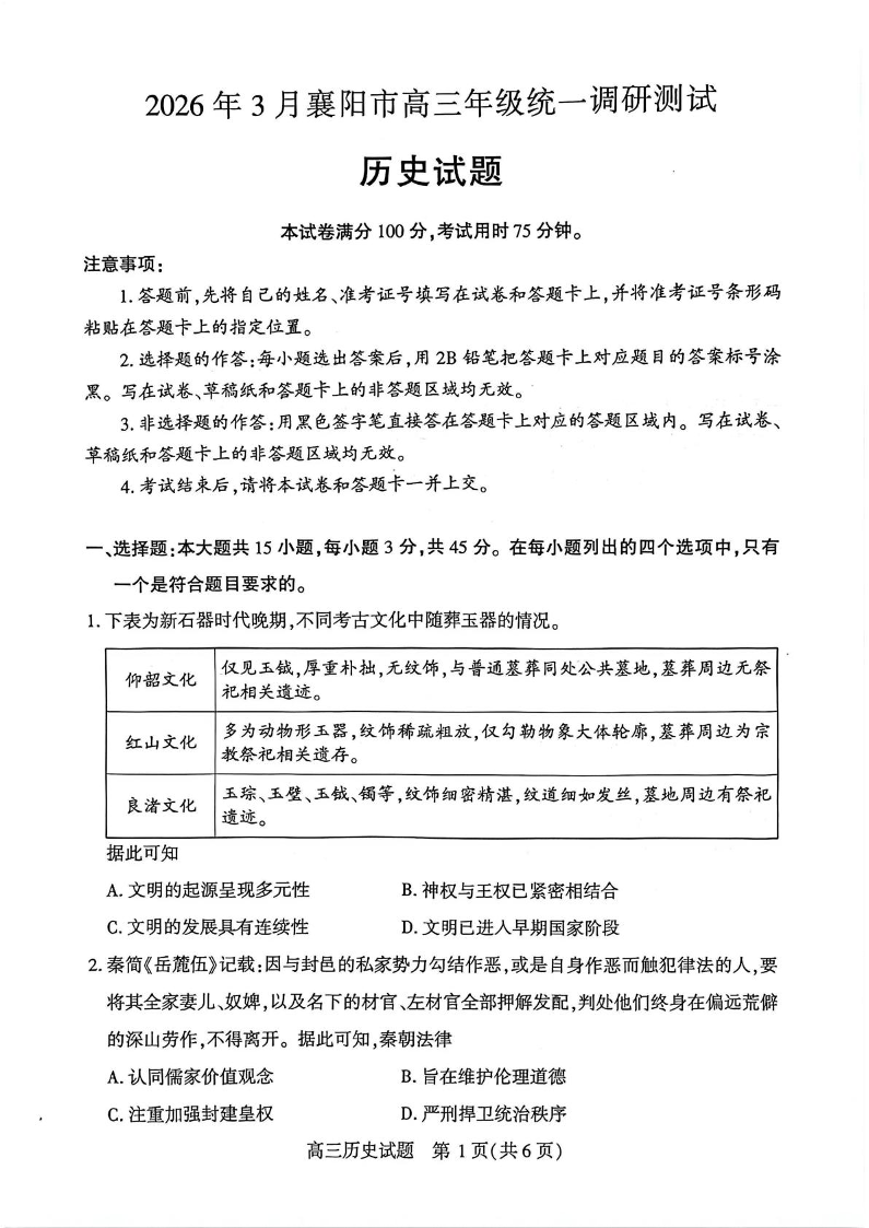 高三历史--湖北襄阳市2026届高三3月统一调研测试