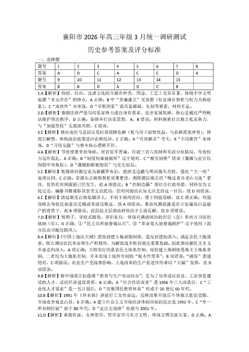 高三历史答案--湖北襄阳市2026届高三3月统一调研测试