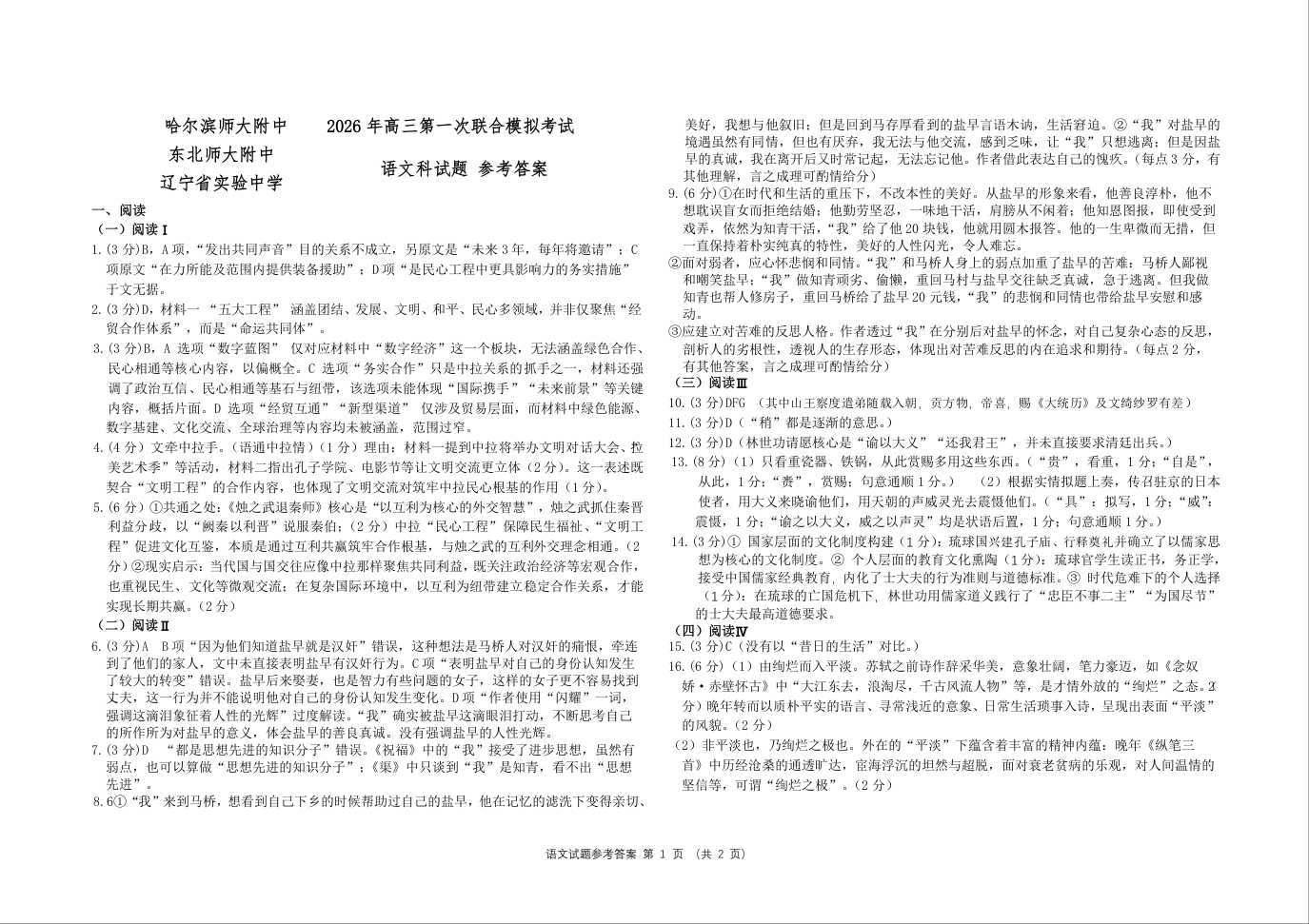 高三语文答案--东北三省三校(辽宁实验中学、东北师大附中、哈师大附中)2026届高三下学期第一次联合模拟考