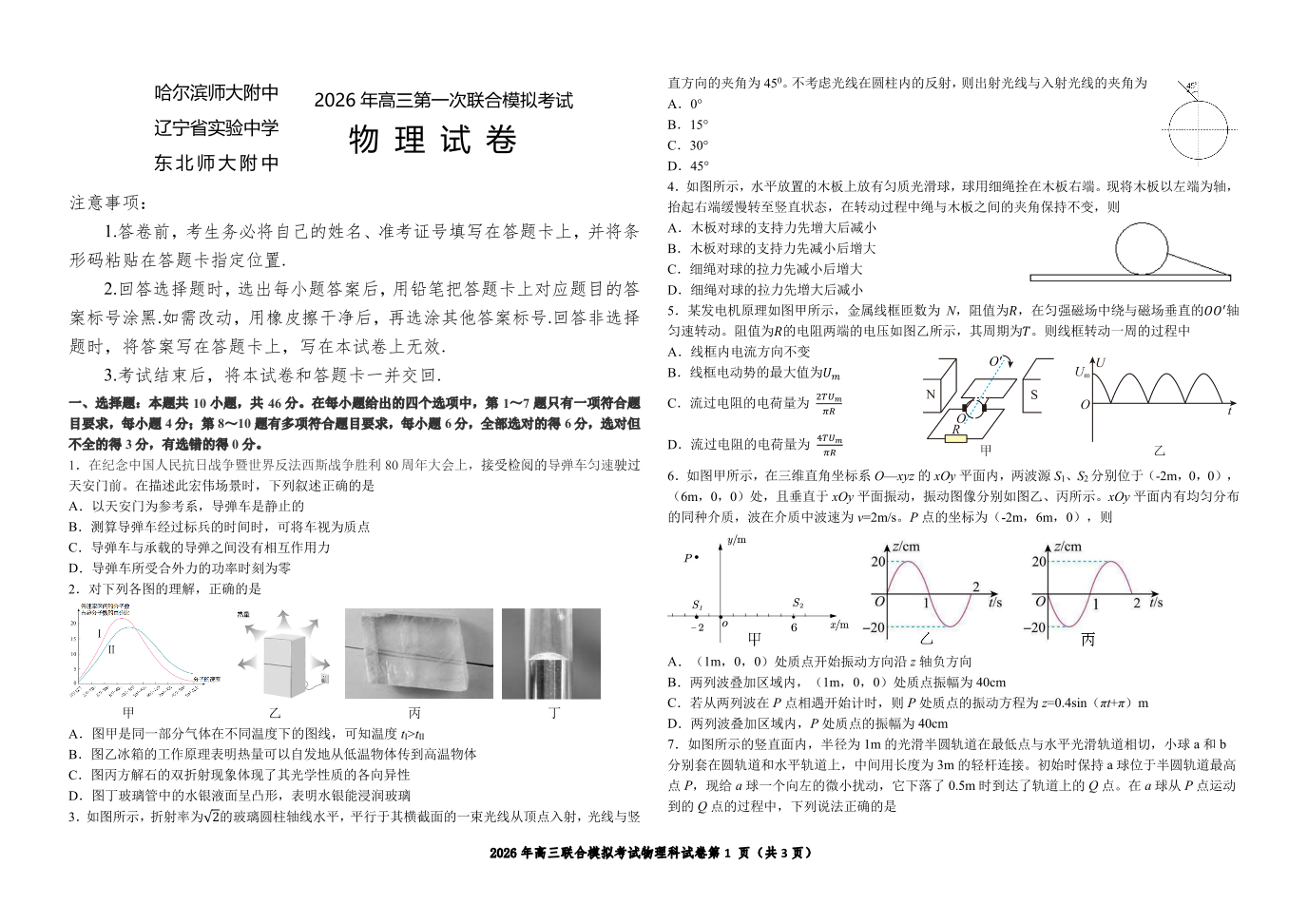 高三物理--东北三省三校(辽宁实验中学、东北师大附中、哈师大附中)2026届高三下学期第一次联合模拟考