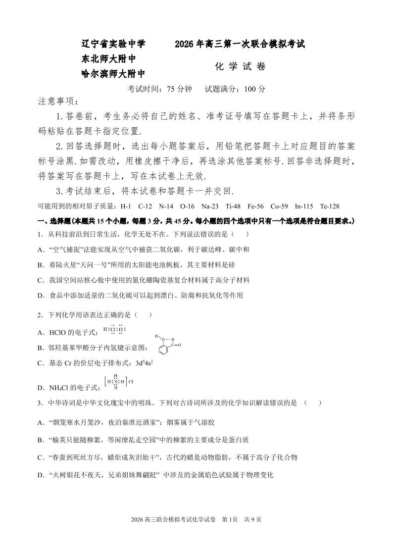 高三化学--东北三省三校(辽宁实验中学、东北师大附中、哈师大附中)2026届高三下学期第一次联合模拟考
