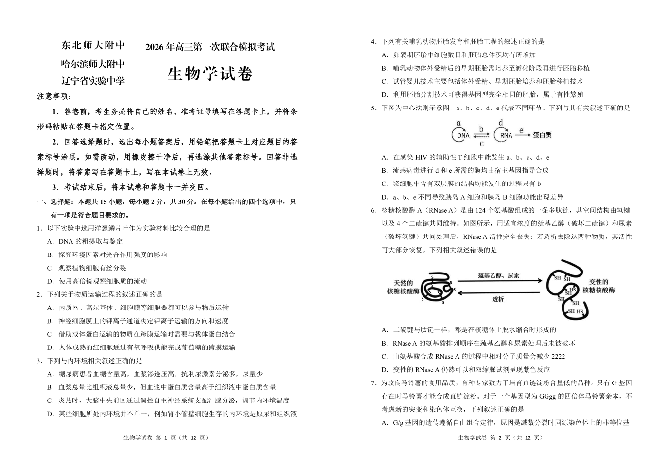 高三生物--东北三省三校(辽宁实验中学、东北师大附中、哈师大附中)2026届高三下学期第一次联合模拟考
