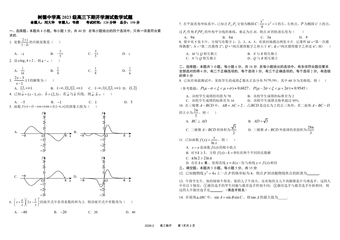 高三数学答案--四川成都市树德中学2026届高三下学期开学考试