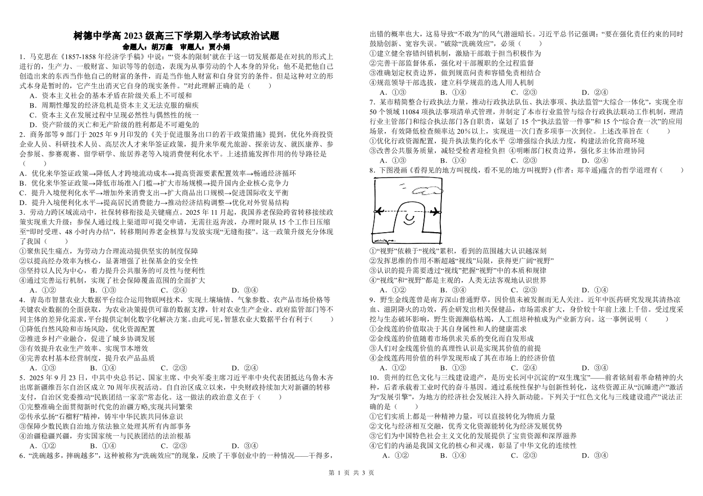 高三政治--四川成都市树德中学2026届高三下学期开学考试