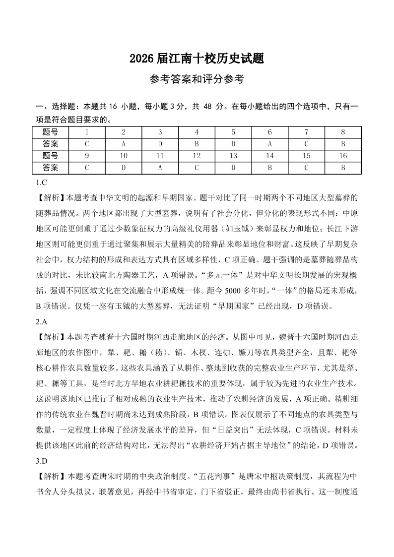 高三历史答案--安徽省江南十校2026届高三下学期3月开学考试