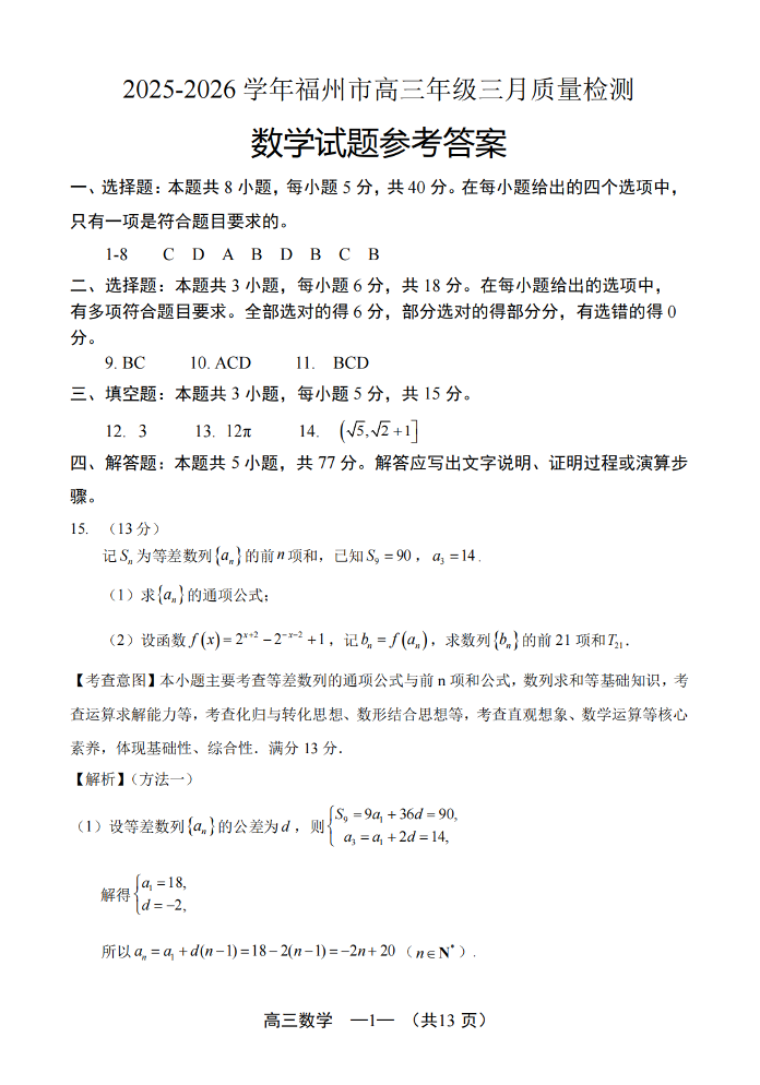 高三数学答案--福建省福州市2026届高三三月质量检测