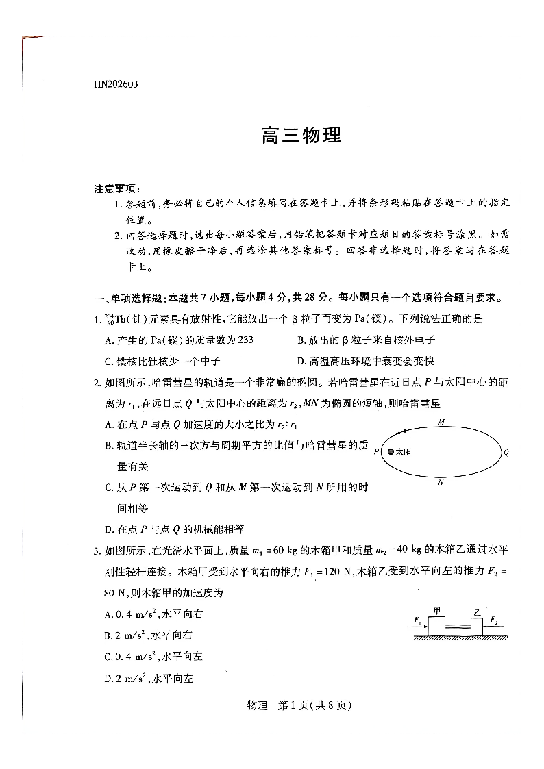 高三物理--河南省部分高中2026届高三下学期3月开学素质评价考试