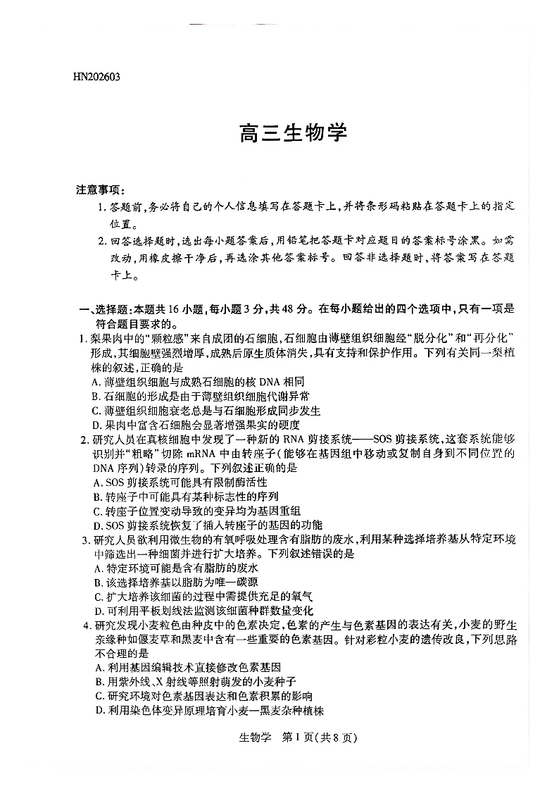 高三生物--河南省部分高中2026届高三下学期3月开学素质评价考试