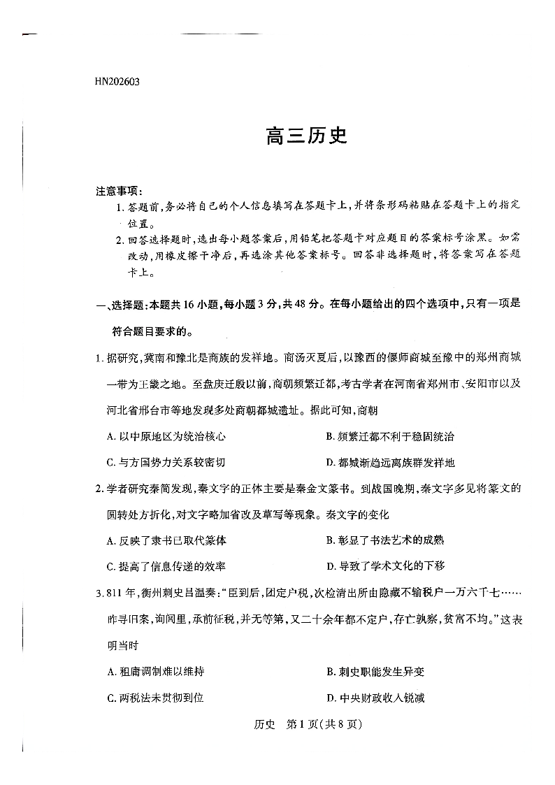 高三历史--河南省部分高中2026届高三下学期3月开学素质评价考试