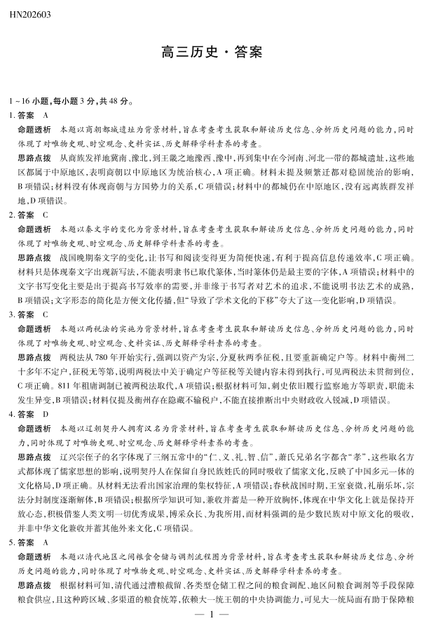高三历史答案--河南省部分高中2026届高三下学期3月开学素质评价考试