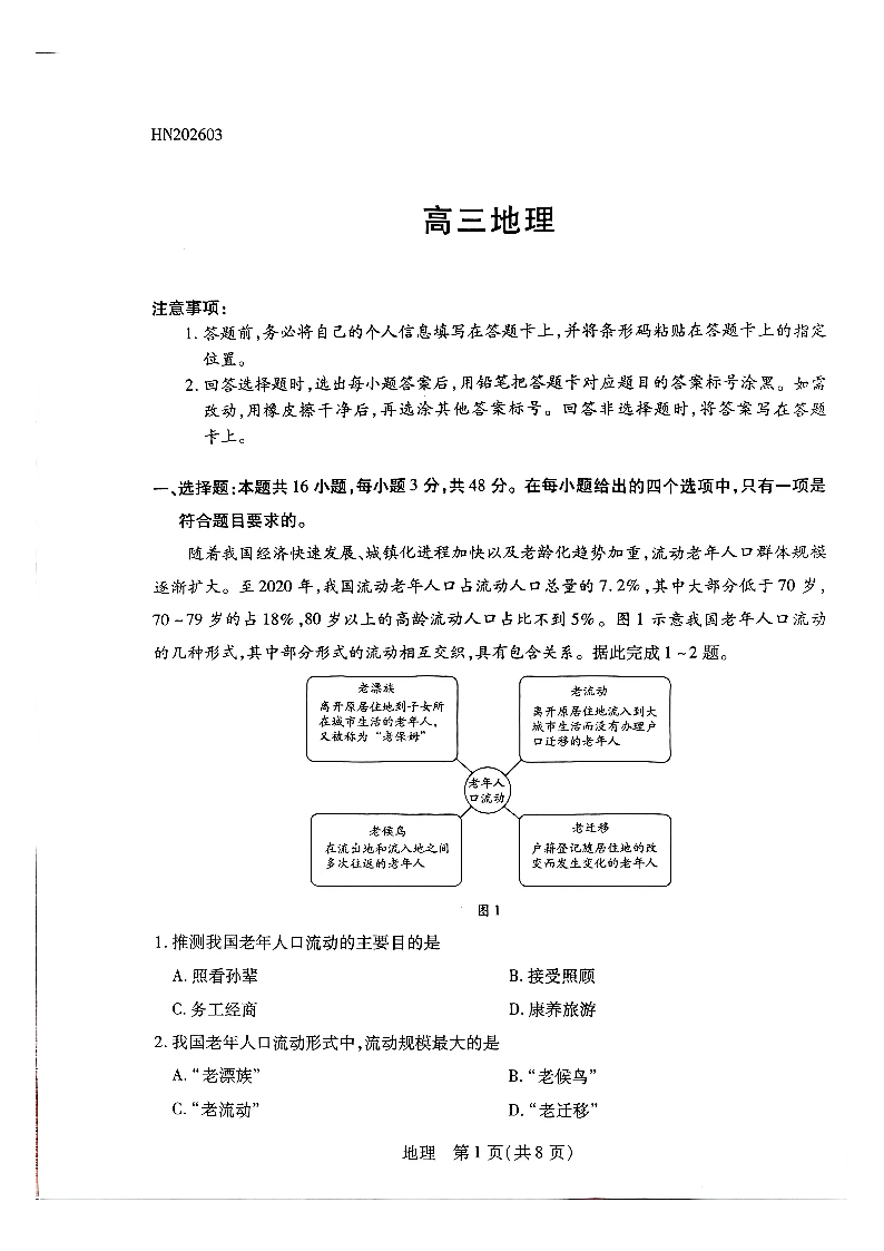 高三地理--河南省部分高中2026届高三下学期3月开学素质评价考试