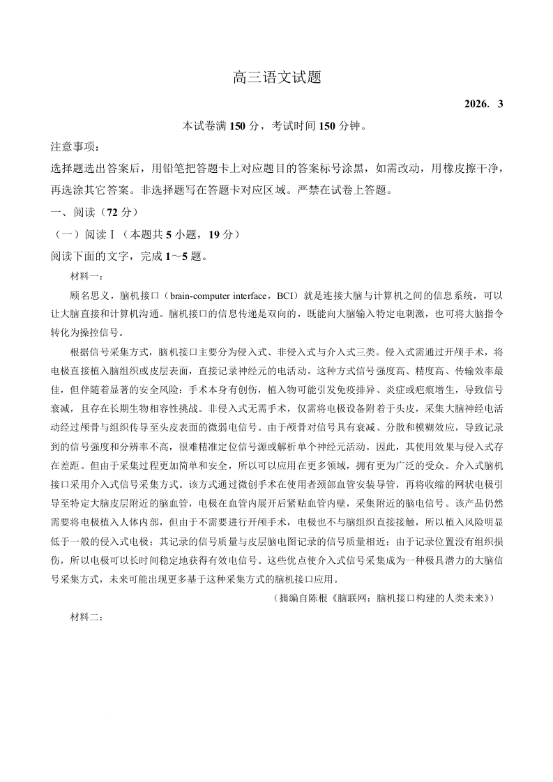 高三语文--山东德州市2026届高三下学期3月一模考试(德州一模)