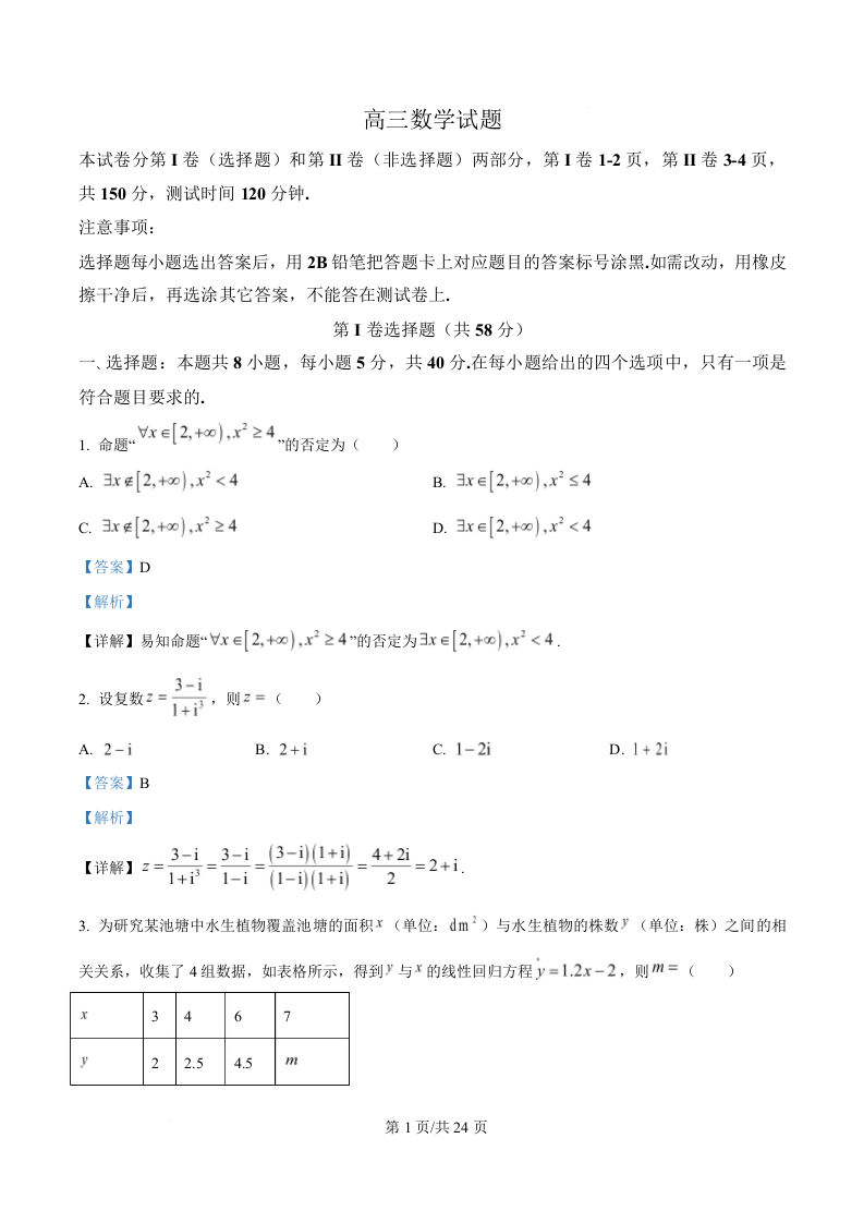 高三数学(解析版)--山东德州市2026届高三下学期3月一模考试(德州一模)