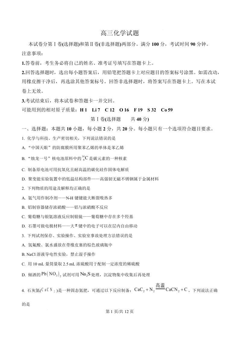 高三化学(原卷版)--山东德州市2026届高三下学期3月一模考试(德州一模)