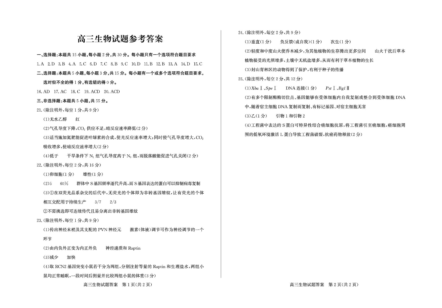 高三生物答案--山东德州市2026届高三下学期3月一模考试(德州一模)