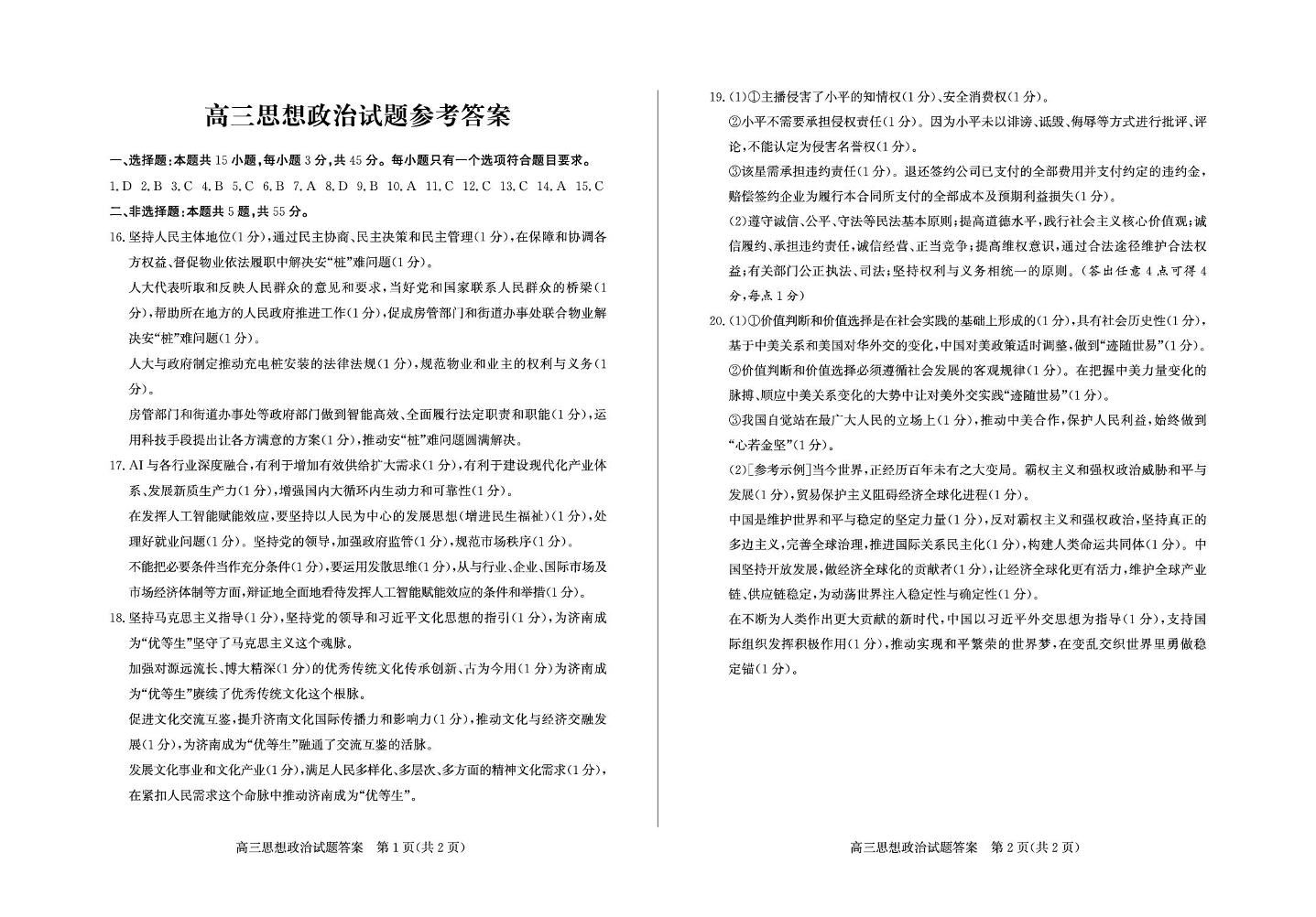 高三政治答案--山东德州市2026届高三下学期3月一模考试(德州一模)