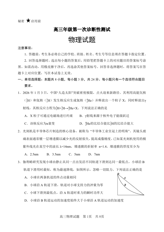 高三物理--山东东营市2026届高三下学期第一次诊断性考试(东营一模)