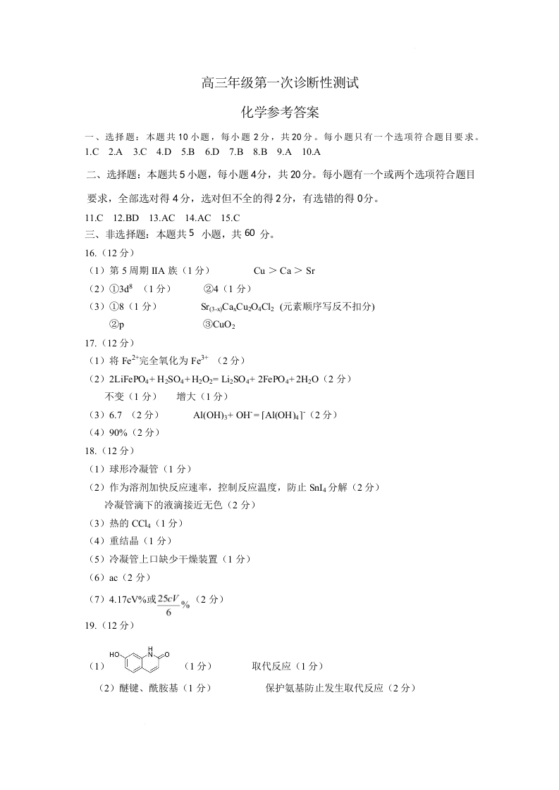 高三化学答案--山东东营市2026届高三下学期第一次诊断性考试(东营一模)