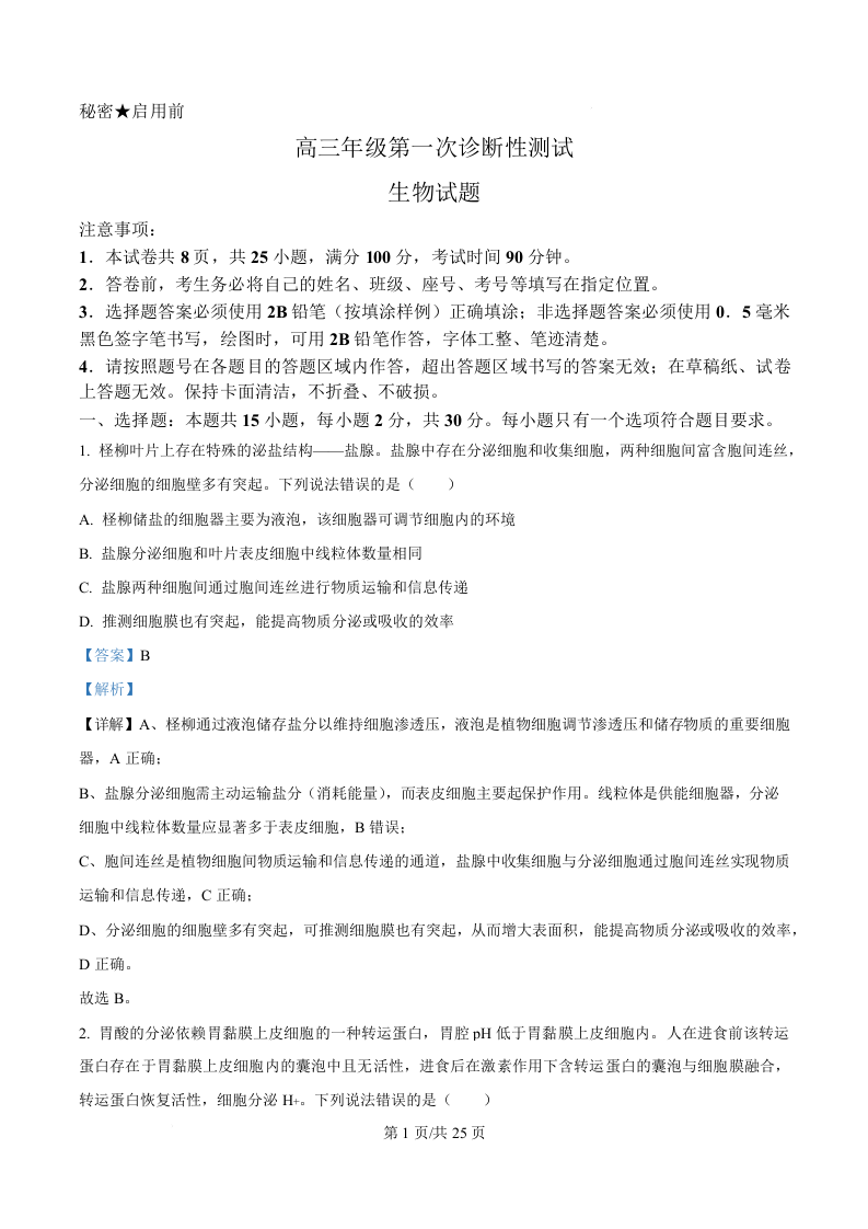 高三生物(精品解析版)--山东东营市2026届高三下学期第一次诊断性考试(东营一模)