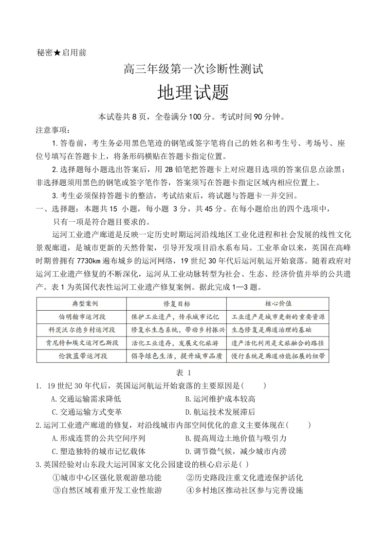高三地理--山东东营市2026届高三下学期第一次诊断性考试(东营一模)