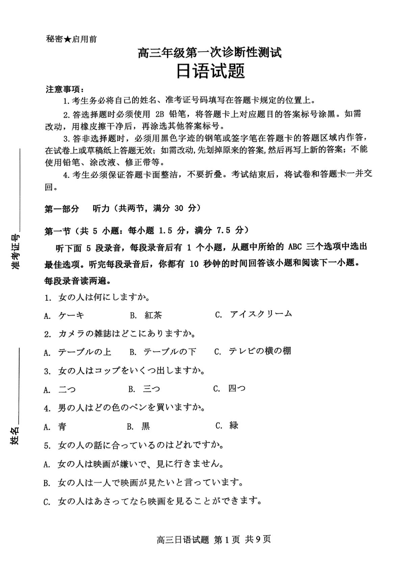 高三日语+答案--山东东营市2026届高三下学期第一次诊断性考试(东营一模)