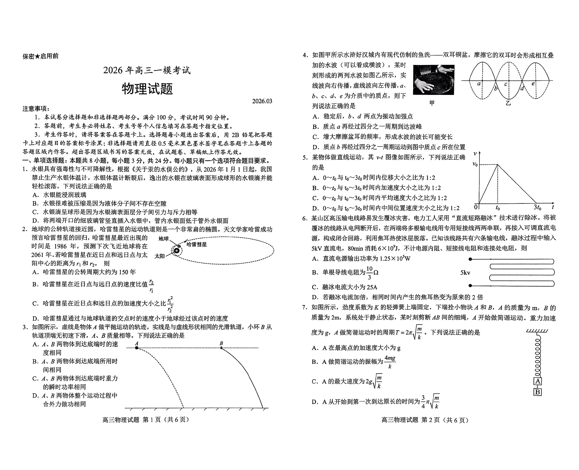 高三物理--山东菏泽市2026届高三下学期3月一模考试