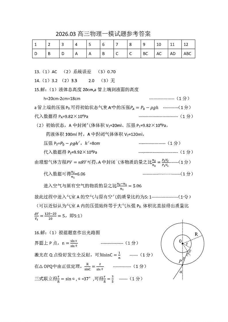 高三物理答案--山东菏泽市2026届高三下学期3月一模考试