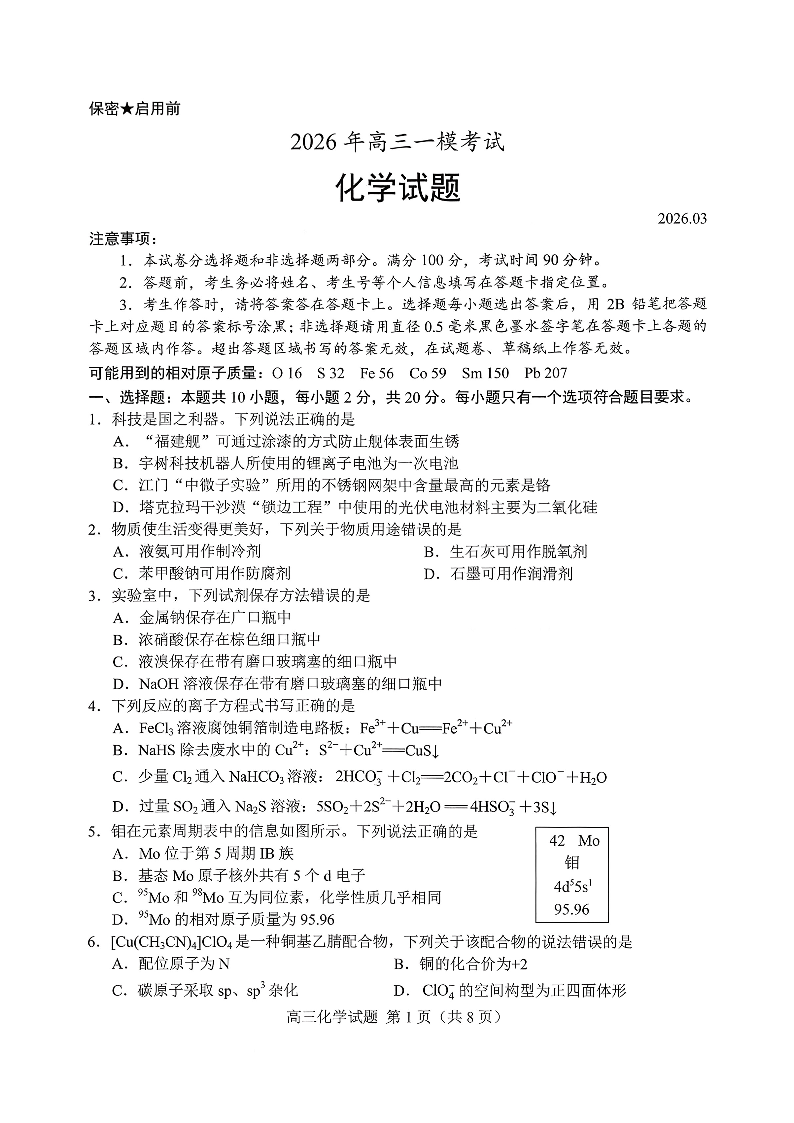 高三化学--山东菏泽市2026届高三下学期3月一模考试